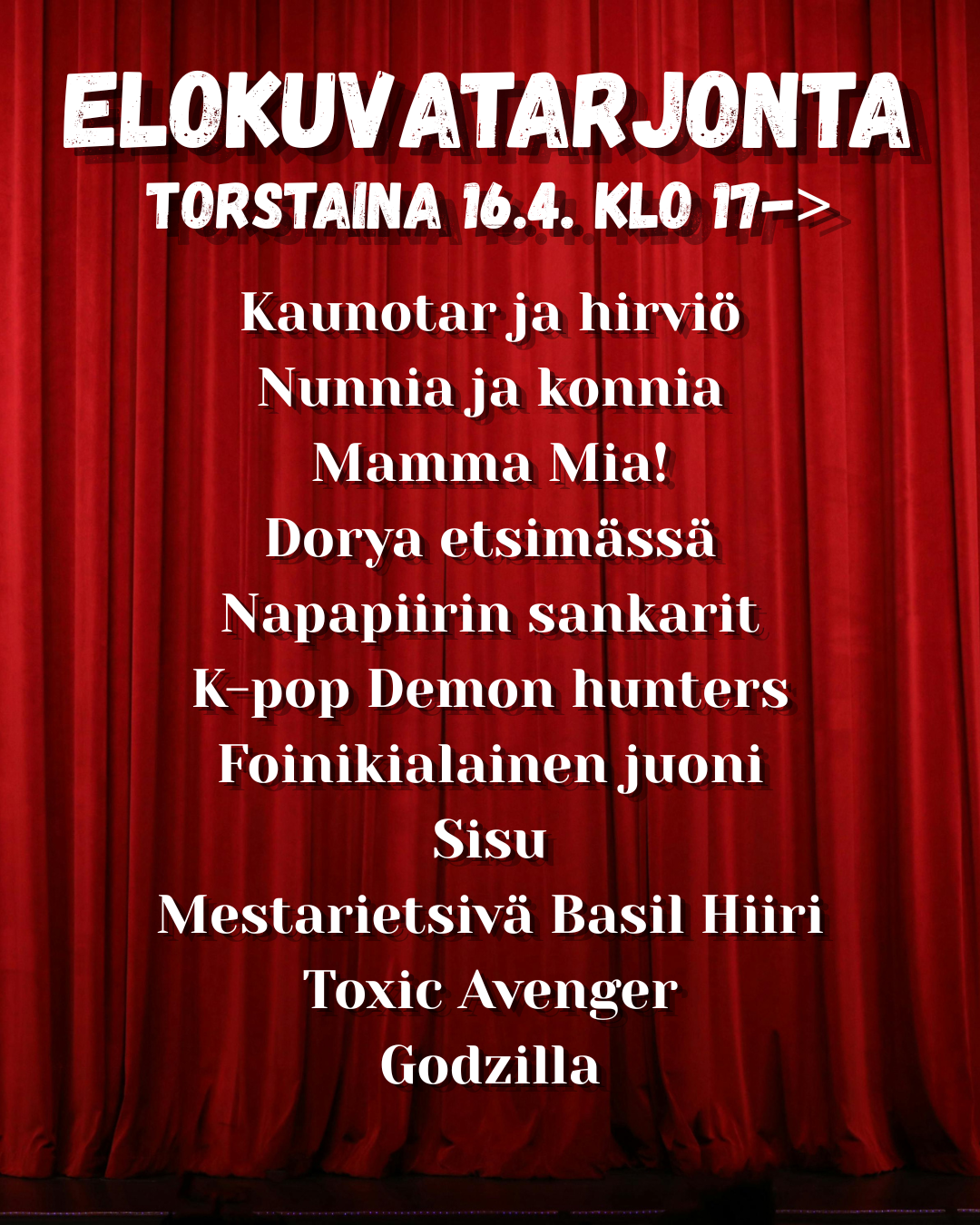 venuelle 16.4.* *17.00 eteenpäin ->* Katsomme leffoja iltaviidestä yön